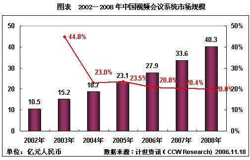在2003年的井噴式發(fā)展之后,視頻會議系統(tǒng)市場發(fā)展速度開始進入低速發(fā)展階段,市場逐漸出現(xiàn)飽和的趨勢。計世資訊(CCW Research)最新視頻會議報告數(shù)據(jù)顯示,從2003年非典時期視頻會議市場井噴式發(fā)展之后,2006年視頻會議系統(tǒng)的增長率開始下降,如何開發(fā)新的產(chǎn)品,成為視頻會議系統(tǒng)市場繼續(xù)發(fā)展的關(guān)鍵。而3G商用的到來,由此產(chǎn)生的移動視頻業(yè)務(wù)也必將成為未來移動通信新的市場增長點,可以說,移動信息化建設(shè)將為視頻會議系統(tǒng)開拓一片新的藍海。