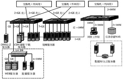 核心包括以下子系統(tǒng):WEB服務子系統(tǒng)、認證服務器、CDN調(diào)度/下載服務器、流媒體播出服務子系統(tǒng)、DRM認證服務子系統(tǒng)、數(shù)據(jù)庫服務子系統(tǒng)、后備存儲NAS系統(tǒng)、內(nèi)部管理服務子系統(tǒng)等。