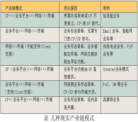 =>網(wǎng)絡(luò)< =>終端,而現(xiàn)實(shí)中的產(chǎn)業(yè)鏈模式可以通過該模式變化得到,如下表所示。