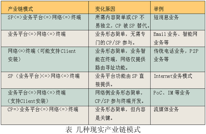 CP=> SP< =>業(yè)務(wù)平臺(tái)< =>網(wǎng)絡(luò)< =>終端,而現(xiàn)實(shí)中的產(chǎn)業(yè)鏈模式可以通過(guò)該模式變化得到,如下表所示。