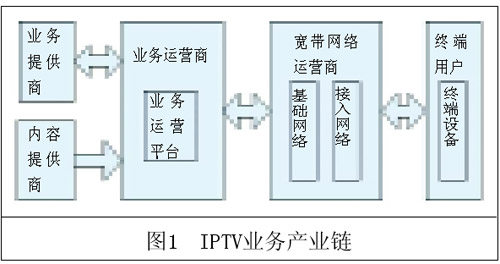 圖1所示的IPTV業(yè)務(wù)產(chǎn)業(yè)鏈中,主要角色包括內(nèi)容提供商/業(yè)務(wù)提供商(CP/SP)、業(yè)務(wù)運(yùn)營(yíng)商、網(wǎng)絡(luò)運(yùn)營(yíng)商和終端用戶(hù)。業(yè)務(wù)運(yùn)營(yíng)商具有IPTV業(yè)務(wù)運(yùn)營(yíng)資質(zhì),通過(guò)業(yè)務(wù)運(yùn)營(yíng)平臺(tái)保證業(yè)務(wù)的提供和管理運(yùn)營(yíng),起著業(yè)務(wù)主導(dǎo)的作用;內(nèi)容提供商為業(yè)務(wù)運(yùn)營(yíng)商提供內(nèi)容,業(yè)務(wù)提供商向業(yè)務(wù)運(yùn)營(yíng)商提供增值業(yè)務(wù),使得業(yè)務(wù)中的內(nèi)容和種類(lèi)豐富多彩以滿足用戶(hù)的不同需求,內(nèi)容提供商和業(yè)務(wù)提供商一般能根據(jù)用戶(hù)的使用情況獲取收入分成;