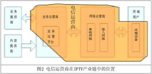 根據(jù)以上的分析,可以看出,電信運(yùn)營(yíng)商在IPTV產(chǎn)業(yè)鏈中居于主導(dǎo)地位,但與廣電部門(mén)的關(guān)系仍然需要理順,才能真正在IP網(wǎng)絡(luò)上發(fā)展好視頻類(lèi)業(yè)務(wù)。圖2示意了電信運(yùn)營(yíng)商在IPTV中的位置。