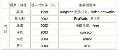 歐洲部分國家和地區(qū)進(jìn)入IPTV市場的年份及主要運(yùn)營商