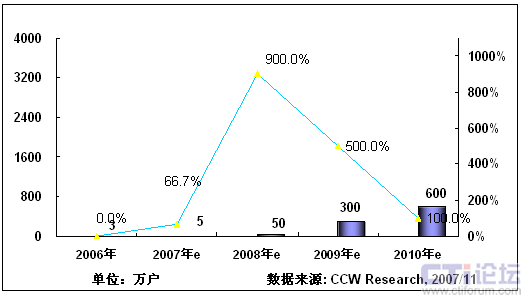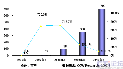 2008年,隨著3G在中國商用,以及奧運帶來豐富視頻內(nèi)容,將推動手機電視作為一項重要的移動增值業(yè)務(wù)將進(jìn)入市場發(fā)展期;同時隨著網(wǎng)絡(luò)、終端、內(nèi)容、商業(yè)模式等因素的發(fā)展,產(chǎn)業(yè)鏈初步完善,看好手機電視業(yè)務(wù)的產(chǎn)業(yè)鏈各環(huán)節(jié)大力介入,北京奧運會將大大激發(fā)用戶使用手機電視業(yè)務(wù)的熱情,從而推動手機電視進(jìn)入快速發(fā)展階段。根據(jù)計世資訊預(yù)計,2008年中國手機電視用戶將達(dá)到400萬。