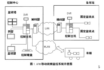 移動視頻監(jiān)視系統(tǒng)主要包括前端設(shè)備、后端設(shè)備和傳輸設(shè)備組成。前端設(shè)備主要指圖像攝取設(shè)備(如各種類型的攝像機),后端設(shè)備主要指圖像顯示、圖像錄制、系統(tǒng)控制等設(shè)備,前后端需要通過傳輸系統(tǒng)連接。為了支持系統(tǒng)的移動功能,傳輸環(huán)節(jié)中至少有一部分是無線傳輸系統(tǒng)。APM移動視頻監(jiān)控系統(tǒng)的組成如圖1所示。