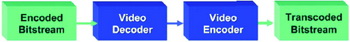 視頻轉(zhuǎn)碼是一個(gè)高運(yùn)算負(fù)荷的過(guò)程,需要對(duì)輸入的視頻流進(jìn)行全解碼、視頻過(guò)濾/圖像處理、并且對(duì)輸出格式進(jìn)行全編碼。最簡(jiǎn)單的轉(zhuǎn)碼過(guò)程(圖3)僅僅涉及到解碼一個(gè)比特流和用不同的編解碼器重新編碼兩個(gè)步驟。這種硬轉(zhuǎn)碼看似很簡(jiǎn)單,只需要一個(gè)解碼器和一個(gè)編碼器,但是最終顯示結(jié)果并不理想,因?yàn)橐曨l數(shù)據(jù)解碼后重新編碼會(huì)降低畫質(zhì)。