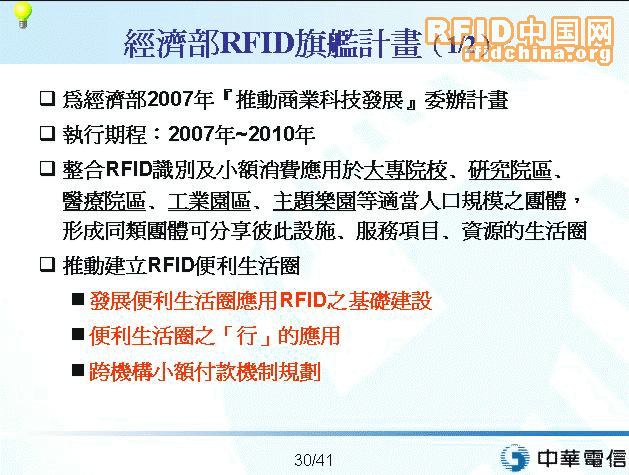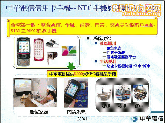 中華電信作為臺(tái)灣省最大的綜合型電信服務(wù)公司,其發(fā)展策略和投資方向,將決定了臺(tái)灣電信運(yùn)營業(yè)的發(fā)展方向。在近期舉辦的一次RFID產(chǎn)業(yè)高峰論壇上,中華電信公司電信研究所張光耀副所長,全面介紹了中華電信在RFID/NFC/手機(jī)支付領(lǐng)域里的研發(fā)及推進(jìn)情況。
