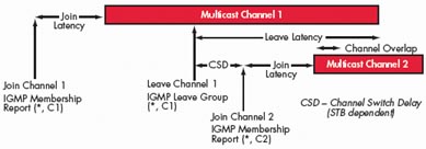 TV節(jié)目通常采用組播方式進(jìn)行傳送。組播是一種允許一個(gè)或多個(gè)發(fā)送者(組播源)一次同時(shí)發(fā)送單一的數(shù)據(jù)包到多個(gè)接收者的網(wǎng)絡(luò)技術(shù)。組播源把數(shù)據(jù)包發(fā)送到特定組播組,而只有屬于該組播組的地址才能接收到數(shù)據(jù)包。在IPTV里,組播源往往僅有一個(gè),即使用戶(hù)數(shù)量成倍增長(zhǎng),主干帶寬也不需隨之增加,因?yàn)闊o(wú)論有多少個(gè)目標(biāo)地址,在整個(gè)網(wǎng)絡(luò)的任何一條主干鏈路上只傳送單一視頻流,即所謂“一次發(fā)送,組內(nèi)廣播”。組播提高了數(shù)據(jù)傳送效率,減少了主干網(wǎng)出現(xiàn)擁塞的可能性。對(duì)于TV系統(tǒng)而言,其所能夠支持的用戶(hù)數(shù)目?jī)H僅受到接入網(wǎng)絡(luò)能力的限制,與前端推送系統(tǒng)的推送能力無(wú)關(guān)。因此,TV業(yè)務(wù)性能的主要測(cè)試指標(biāo)包括所推送的最大頻道數(shù)目、頻道平均帶寬、平均頻道切換時(shí)間、I幀加入延時(shí)、平均頻道離開(kāi)延時(shí)、平均頻道加入延時(shí)、頻道重疊時(shí)間和頻道間隔時(shí)間。