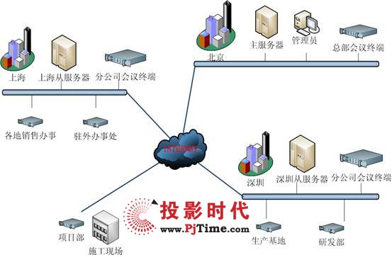 3臺(tái)高端專(zhuān)用服務(wù)器作為視頻會(huì)議服務(wù)器,可容納多點(diǎn)同時(shí)開(kāi)會(huì),以確保系統(tǒng)的穩(wěn)定性和性能要求。主服務(wù)器放置在總公司,從服務(wù)器共2個(gè),分別放置在輻射分公司面大,位于分公司中心的兩個(gè)城市。所有接入的服務(wù)器和客戶(hù)端采用同一網(wǎng)絡(luò)服務(wù)商的線(xiàn)路。配置了使用1000M服務(wù)器專(zhuān)用網(wǎng)卡,以保證正常的音視頻信號(hào)的傳輸。并且將服務(wù)器放置在主干/核心交換機(jī)上,使服務(wù)器和客戶(hù)端的路由/交換性能達(dá)到最佳效果。其網(wǎng)絡(luò)拓?fù)鋱D如下: