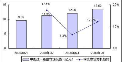 賽迪顧問預(yù)測,2008年全年中國統(tǒng)一通信市場都將保持快速的增長勢頭,雖然第三季度增長趨勢有所放緩,全球金融海嘯的反作用將進一步提高企業(yè)對統(tǒng)一通信產(chǎn)品的認(rèn)知,促進中國統(tǒng)一通信市場的發(fā)展,第四季度市場將出現(xiàn)反彈趨勢,增長速度超過12%,市場規(guī)模13.53億元,2008年全年中國統(tǒng)一通信市場規(guī)模將達到46.6億元,同比增長超過50%。