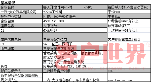 目前一汽-大眾旗下有奧迪、大眾兩個(gè)品牌,涉及十幾種汽車產(chǎn)品,全部由呼叫中心通過(guò)4008 171 888和0431-85990888兩個(gè)號(hào)碼來(lái)統(tǒng)一服務(wù)。一汽-大眾呼叫中心為了提高客戶滿意度,把座席分成奧迪、大眾兩個(gè)品牌獨(dú)立服務(wù);熱線電話的IVR設(shè)置分為一層,奧迪請(qǐng)按“1”,大眾請(qǐng)按“2”,提供清晰便捷的服務(wù),為客戶提供售前咨詢、售后咨詢、售前投訴、售后投訴服務(wù);結(jié)構(gòu)清晰而且采用主動(dòng)服務(wù)和客戶關(guān)愛(ài)的服務(wù)理念。為了最大限度接通每一通電話,將呼損率作為部門的KPI績(jī)效指標(biāo)。并不斷的提升整體服務(wù)水平。