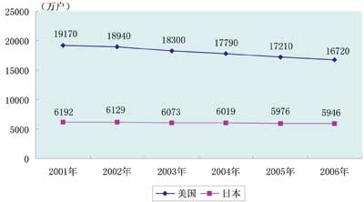 關(guān)于固定電話受沖擊的現(xiàn)象,美國(guó)比日本更加突出,這是因?yàn)槊绹?guó)大的通信公司除了提供電話、電視和高速上網(wǎng)捆綁服務(wù)外,基本上不提供IP電話(普通電話機(jī)經(jīng)本地市話交換機(jī)以及網(wǎng)關(guān)進(jìn)入因特網(wǎng))和VoIP電話(普通電話機(jī)經(jīng)電話連接器進(jìn)入因特網(wǎng))。美國(guó)衛(wèi)生統(tǒng)計(jì)中心公布的數(shù)據(jù)顯示,2007年下半年,美國(guó)只有移動(dòng)電話而沒有固定電話的家庭比例達(dá)到15.8%,這一比例在2004年同期只有6.1%,大約2%的美國(guó)家庭沒有電話。