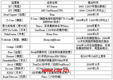 2008年,基于融合性終端的FMC業(yè)務(wù)備受矚目,BT、法國(guó)電信、德國(guó)電信、NTT DoCoMo等運(yùn)營(yíng)商利用UMA技術(shù),提供基于WiFi/GSM或者WiFi/WCDMA雙模終端的FMC業(yè)務(wù),市場(chǎng)反映良好,被運(yùn)營(yíng)商作為未來重點(diǎn)發(fā)展的業(yè)務(wù),預(yù)計(jì)2010年全球FMC用戶將達(dá)到3