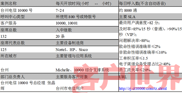 中國電信臺州市的10000客服中心,擁有100多名員工,承擔該市電信公司對外的所有客戶服務(wù)工作。中心先后被浙江省電信工會授予“先進女職工集體”,浙江省電信分公司授予“學習型示范班組”、“創(chuàng)建學習型組織先進班組(團隊)”,并獲得了“集團公司優(yōu)秀10000號服務(wù)團隊”,同時被中華全國總工會、信息產(chǎn)業(yè)部、共青團中央授予“全國先進女職工集體”以及“全國青年文明號”的稱號,連續(xù)兩年被信息產(chǎn)業(yè)部評定為“全國用戶滿意電信服務(wù)明星班組”。