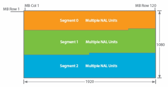 在這種架構(gòu)中,編碼器的實(shí)施分配到多個(gè) DSP 內(nèi)核。每個(gè)宏塊條都分配到一個(gè)DSP內(nèi)核。其中每個(gè)內(nèi)核都提供一些特定功能,如:速率控制與幀內(nèi)圖像處理。事實(shí)上,無法預(yù)先進(jìn)行比特預(yù)算并分配到各個(gè)宏塊條,因?yàn)椴煌陦K條可能具有不同的圖像復(fù)雜性,而在圖像分割塊之間采用差異很大的Qp值會(huì)造成合成圖像的層邊界出現(xiàn)偽影。在H.264中,宏塊條NAL可以包含任意數(shù)量的宏塊,因此與H.263不同,圖像分割塊的形狀無需符合GOB邊界。每個(gè)宏塊條的頭部(slice