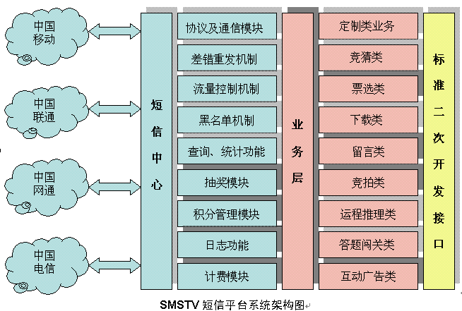 SMSTV短信增值平臺(tái)產(chǎn)品由通信層(短信中心)、業(yè)務(wù)層(業(yè)務(wù)平臺(tái))和接口層(標(biāo)準(zhǔn)二次開(kāi)發(fā)接口)三層組成(參見(jiàn)2.2.2系統(tǒng)架構(gòu)圖),三層之間通過(guò)專有網(wǎng)絡(luò)協(xié)議互聯(lián),實(shí)現(xiàn)高速數(shù)據(jù)通信。