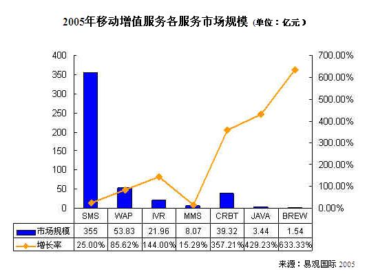 據(jù)易觀國(guó)際《中國(guó)移動(dòng)增值服務(wù)市場(chǎng)綜合分析報(bào)告2005-2006》報(bào)告顯示,2005年在所有的移動(dòng)增值服務(wù)收入當(dāng)中,2G 服務(wù)占到整體收入比例的86.16%,達(dá)到416.28億元。2.5G 服務(wù)僅占到整體收入比例的16.84%,達(dá)到66.88億元。其中 CRBT 市場(chǎng)規(guī)模比去年增長(zhǎng)了30.72億,同比增長(zhǎng)357.21%,其次是 WAP 市場(chǎng)規(guī)模比去年增長(zhǎng)了24.83億,同比增長(zhǎng)85.62%,成為2005年增長(zhǎng)速度和幅度最快的移動(dòng)增值服務(wù)。