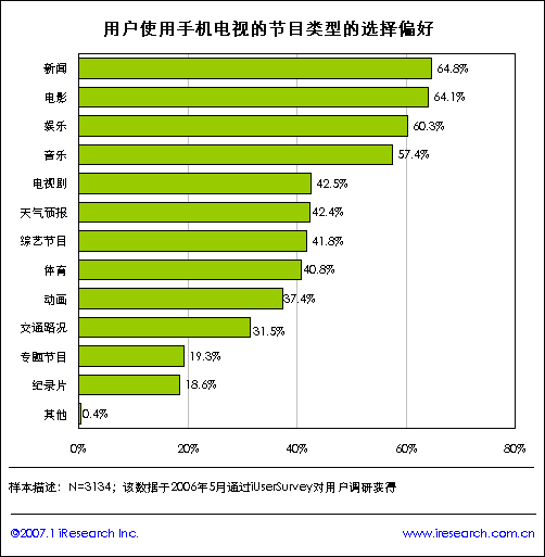 iReserach艾瑞市場(chǎng)咨詢(xún)《2007年手機(jī)電視研究報(bào)告》研究結(jié)果顯示,手機(jī)終端價(jià)格將是影響用戶(hù)使用手機(jī)電視業(yè)務(wù)的首要驅(qū)動(dòng)因素,其次是手機(jī)電視服務(wù)資費(fèi)標(biāo)準(zhǔn)。另外研究數(shù)據(jù)發(fā)現(xiàn),手機(jī)用戶(hù)希望在手機(jī)電視上看到的內(nèi)容類(lèi)別情況:新聞、電影、娛樂(lè)和音樂(lè)是用戶(hù)首要選擇的電視節(jié)目類(lèi)型,用戶(hù)的提及率均在60%以上,另外用戶(hù)希望能夠通過(guò)手機(jī)看電視劇、天氣預(yù)報(bào)、綜合節(jié)目和體育等節(jié)目類(lèi)型。由此發(fā)現(xiàn),新聞、娛樂(lè)和生活類(lèi)資訊是用戶(hù)期望手機(jī)電視節(jié)目的重要類(lèi)型。