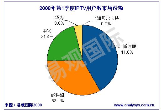 《2008年第1季度中國IPTV市場季度監(jiān)測》數(shù)據顯示,2008年第1季度中國IPTV累計用戶數(shù)達131萬人。根據各廠商中標業(yè)務區(qū)實際發(fā)展的用戶數(shù)排名,UT斯達康、威科姆、中興通訊位居前三。2008年第1季度IPTV廠商的競爭格局沒有顯著變化。