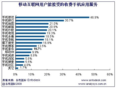 CTI論壇(ctiforum)06月22日消息:據(jù)易觀國際(Analysys International)《中國手機(jī)應(yīng)用市場(chǎng)用戶調(diào)研報(bào)告2009》研究發(fā)現(xiàn),移動(dòng)互聯(lián)網(wǎng)用戶可接受收費(fèi)的應(yīng)用主要是手機(jī)游戲和手機(jī)銀行/支付,其比例分別為47%和31%,而手機(jī)游戲也是移動(dòng)互聯(lián)網(wǎng)用戶使用比例較高的手機(jī)應(yīng)用服務(wù)之一。另外,用戶可接受程度較高的還包括手機(jī)郵箱、手機(jī)導(dǎo)航、手機(jī)炒股、手機(jī)電視/視頻以及手機(jī)殺毒等應(yīng)用。而移動(dòng)互聯(lián)網(wǎng)用戶對(duì)于手機(jī)社區(qū)和手機(jī)搜索收費(fèi)的接受度較低。研究發(fā)現(xiàn),移動(dòng)互聯(lián)網(wǎng)用戶可接受收費(fèi)的應(yīng)用主要是手機(jī)游戲和手機(jī)銀行/支付,其比例分別為47%和31%,而手機(jī)游戲也是移動(dòng)互聯(lián)網(wǎng)用戶使用比例較高的手機(jī)應(yīng)用服務(wù)之一。另外,用戶可接受程度較高的還包括手機(jī)郵箱、手機(jī)導(dǎo)航、手機(jī)炒股、手機(jī)電視/視頻以及手機(jī)殺毒等應(yīng)用。而移動(dòng)互聯(lián)網(wǎng)用戶對(duì)于手機(jī)社區(qū)和手機(jī)搜索收費(fèi)的接受度較低。