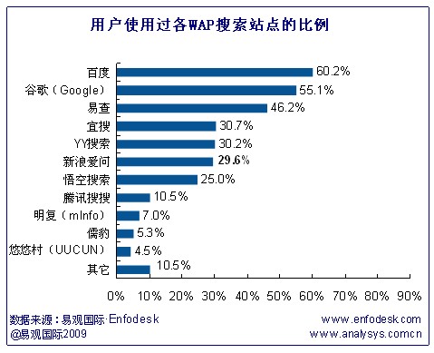 據易觀國際(Analysys International)《中國移動搜索市場用戶調研報告2009》研究發(fā)現此次調研樣本用戶使用過的各WAP搜索站點比例情況基本可以分為三個梯隊: