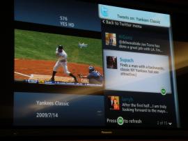 在使用電視窗件時(shí),電視機(jī)屏幕將被分為左右兩塊,Twitter消息顯示在其中一個(gè)屏幕中。這一應(yīng)用在觀看重大事件或者體育賽事時(shí)可以帶來(lái)非常精彩的體驗(yàn)。比如觀看紐約楊基隊(duì)的一場(chǎng)棒球比賽,用戶可以同時(shí)閱讀洋基隊(duì)有關(guān)的Twitter短消息。