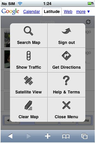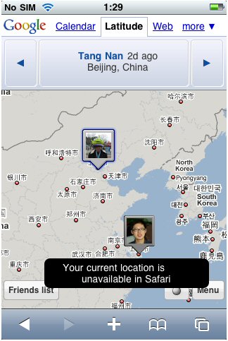 但是我沒找到在哪里設(shè)置自己的Latitude,就是說如果你不想共享自己的位置了怎么辦?想隱藏位置怎么辦?或者iPhone探測(cè)的不準(zhǔn),想手動(dòng)調(diào)節(jié)位置,怎么辦?(當(dāng)然大多數(shù)時(shí)間探測(cè)都是準(zhǔn)的,這個(gè)功能是方便某些人讓別人誤認(rèn)為自己在某個(gè)地方,然后偷偷摸摸的去做別的事情……)這些Phone在網(wǎng)頁里還做不到,但G1可以,畢竟G1是在Google Maps應(yīng)用里完成Latitude的。