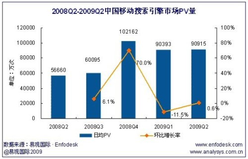 而對(duì)于中國(guó)移動(dòng)搜索引擎的PV進(jìn)行統(tǒng)計(jì)發(fā)現(xiàn):2009年第2季度中國(guó)移動(dòng)搜索因此市場(chǎng)日均PV量達(dá)9.09億次,環(huán)比增長(zhǎng)0.6%,相比去年同期增長(zhǎng)60%。而2009年隨著總體搜索量的增長(zhǎng)PV量不增反減,主要?dú)w因于搜索精確度的大大提升減少用戶單次搜索請(qǐng)求所帶來(lái)的PV量,另一方面用戶對(duì)網(wǎng)頁(yè)之外的音樂、圖片、軟件等內(nèi)容的搜索請(qǐng)求數(shù)增多,但此類內(nèi)容的單次搜索所帶來(lái)的PV明顯小于網(wǎng)頁(yè)搜索所帶來(lái)的PV。
