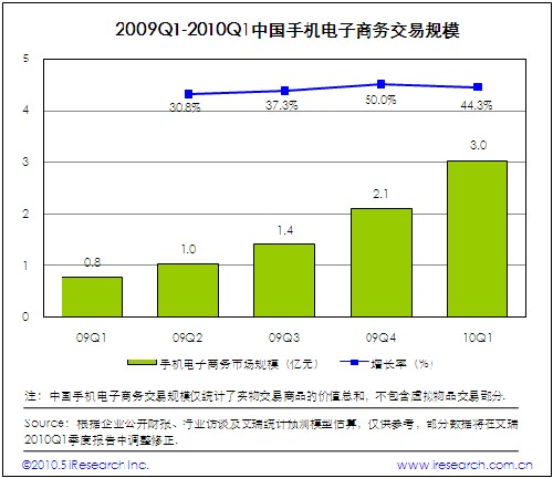 根據(jù)艾瑞咨詢即將發(fā)布的2010年第一季度中國移動互聯(lián)網(wǎng)市場數(shù)據(jù)顯示,2010Q1中國移動互聯(lián)網(wǎng)市場整體交易規(guī)模達(dá)到44.9億,環(huán)比增長5.2%。艾瑞咨詢分析認(rèn)為,盡管電信運(yùn)營商計費政策調(diào)整,對移動增值市場收入產(chǎn)生負(fù)面影響,但是手機(jī)電子商務(wù)、手機(jī)搜索等業(yè)務(wù)領(lǐng)域的良好市場表現(xiàn),推動移動互聯(lián)網(wǎng)市場規(guī)模平穩(wěn)增長。