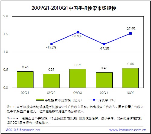 2010Q1中國手機(jī)搜索市場規(guī)模為5500萬,環(huán)比增長27.9%,手機(jī)搜索請求量和PV的大幅增長帶動廣告收入增加。自2009年下半年以來,受手機(jī)上網(wǎng)用戶規(guī)模迅速發(fā)展以及用戶活躍度和黏性顯著增加的影響,手機(jī)搜索市場進(jìn)入快速發(fā)展階段。與此同時,手機(jī)搜索企業(yè)紛紛加大市場投入力度,建立與電信運(yùn)營商和手機(jī)終端廠商的深度合作關(guān)系是業(yè)務(wù)拓展的重點方向。此外,網(wǎng)頁產(chǎn)品和客戶端軟件深度整合也是手機(jī)搜索企業(yè)布局移動互聯(lián)網(wǎng)市場的最佳實踐。受谷歌事件影響,艾瑞預(yù)計2010Q2手機(jī)搜索市場集中度將進(jìn)一步提高。