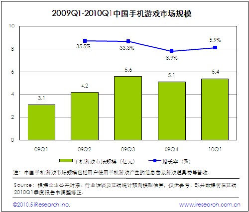 2010Q1中國手機(jī)游戲市場規(guī)模為5.4億,環(huán)比增長5.9%.2009年底電信運(yùn)營商調(diào)整業(yè)務(wù)合作伙伴計費政策,導(dǎo)致WAP和G+手機(jī)游戲平臺等特定計費平臺暫時停止計費,對手機(jī)游戲市場營收增長產(chǎn)生不利影響。除了季節(jié)因素以外,手機(jī)單機(jī)游戲受電信運(yùn)營商暫停WAP計費影響較大,手機(jī)網(wǎng)游受政策影響有限。盡管本季度手機(jī)游戲市場扭轉(zhuǎn)營收規(guī)模下滑的不利局面,重新恢復(fù)增長態(tài)勢,但是手機(jī)游戲?qū)﹄娦胚\(yùn)營商計費通道的高依存度,決定行業(yè)受政策風(fēng)險的影響較大。實現(xiàn)營收多元化是手機(jī)游戲業(yè)界思考和關(guān)注的問題。
