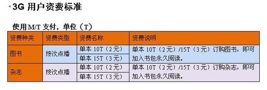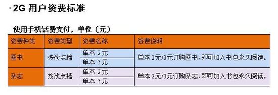 據(jù)了解,中國聯(lián)通手機閱讀業(yè)務只針對聯(lián)通網(wǎng)內(nèi)手機用戶,采用按次點播(按本訂購)的資費標準。同時,2G用戶和3G用戶采用不同的支付方式,2G用戶使用手機話費支付,3G用戶使用M/T支付。