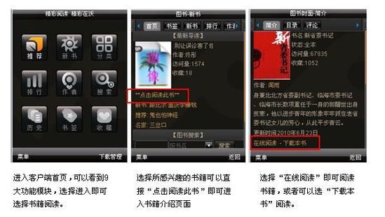 據(jù)了解,中國聯(lián)通手機閱讀業(yè)務分為三個專區(qū)。目前,圖書頻道包括16類24000余本圖書,雜志頻道包括17類500余本雜志。此外,用戶可選擇進入聽書頻道,下載并收聽圖書。