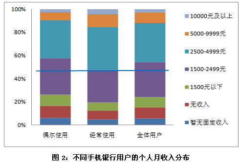通過(guò)對(duì)不同手機(jī)銀行用戶的個(gè)人月收入分布可以看出,經(jīng)常使用手機(jī)銀行業(yè)務(wù)的用戶的個(gè)人月收入偏高,其中,個(gè)人月收入5000元以上的比例為15.4%,2500元以上的比例為52.2%,均高于偶爾使用手機(jī)銀行業(yè)務(wù)的用戶。事實(shí)上,經(jīng)常使用手機(jī)銀行業(yè)務(wù)的用戶由于收入偏高且手機(jī)銀行使用頻率高,必然成為手機(jī)銀行業(yè)務(wù)的核心客戶,這一較為富裕的目標(biāo)群體將在很大程度上促進(jìn)手機(jī)銀行業(yè)務(wù)的繁榮。
