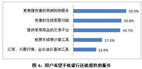 根據(jù)用戶調(diào)研數(shù)據(jù)分析,超過(guò)四成的手機(jī)銀行用戶能夠接受對(duì)金融產(chǎn)品如手機(jī)炒股和手機(jī)支付實(shí)行收費(fèi),同時(shí),有約兩成的用戶能夠接受對(duì)手機(jī)游戲和手機(jī)地圖導(dǎo)航實(shí)行收費(fèi)。這表明,對(duì)特定的手機(jī)應(yīng)用服務(wù)收費(fèi)能夠得到部分用戶的接受和認(rèn)可。