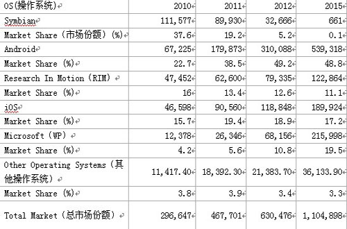 預(yù)計(jì)到2011年底,Android系統(tǒng)將在全球操作系統(tǒng)市場(chǎng)中占據(jù)38.5%的份額,超過Symbian系統(tǒng),預(yù)計(jì)Symbian將達(dá)到19.2%的市場(chǎng)份額。蘋果的iOS系統(tǒng)將在2011年成為第二大受歡迎的操作系統(tǒng),占據(jù)19.4%的市場(chǎng)份額,位列第三位的是 RIM (13.4%),第四位是微軟 WP(5.6%)。