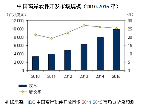 IDC數(shù)據(jù)顯示,2010年中國離岸軟件開發(fā)市場規(guī)模達到33.57億美元,同比增長21.6%,預(yù)計未來五年將以24.2% 的復(fù)合增長率快速攀升。