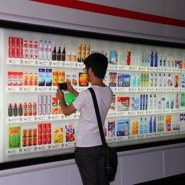 這種虛擬商店消費(fèi)模式如今正漂洋過海而來,北京移動(dòng)此前就曾推出過麥當(dāng)勞電子兌換單服務(wù),用戶可以通過短信接收二維碼,再去麥當(dāng)勞門店掃描兌現(xiàn)。而細(xì)心的申城用戶如今也能在軌交過道中發(fā)現(xiàn)這樣的虛擬百貨商店廣告,這些燈箱廣告中出現(xiàn)了超市中才能見到的商品貨架,五顏六色的商品圖案讓人仿佛置身于大型超市一樣,但只有當(dāng)你走近才會(huì)發(fā)現(xiàn)“貨架”竟然是“貼”在墻上的,從零食到衣服,甚至還有尿片,這里每一種產(chǎn)品下方都有相應(yīng)價(jià)格和二維碼。