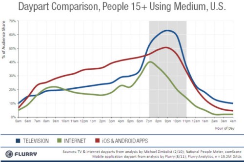 移動(dòng)分析公司Flurry的一項(xiàng)最新研究表明,和電視節(jié)目有黃金收視時(shí)段一樣,移動(dòng)應(yīng)用也有黃金使用時(shí)段,晚上7點(diǎn)左右是用戶(hù)使用移動(dòng)應(yīng)用的頂峰期。