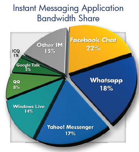 WhatsApp,跨平臺(tái)移動(dòng)信息app發(fā)展很快,從2011年上半年的不到3%增長(zhǎng)至11%。Yahoo信使,曾是近些年的主流即時(shí)通信應(yīng)用,下降明顯,從29%將至17%。QQ則有8%的流量份額。