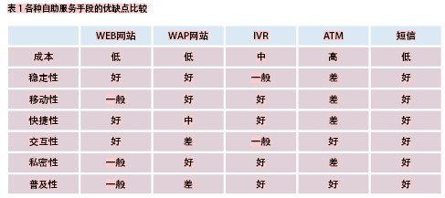 隨著電子化技術(shù)和互聯(lián)網(wǎng)技術(shù)的發(fā)展和普及,各家運營商都開始推出各種自助化手段分流人工服務(wù)壓力,改善用戶滿意度。主要的電子化自助手段有WEB網(wǎng)站、WAP網(wǎng)站、IVR語音交互應(yīng)答、ATM自動柜員機。每種自助袷侄味加釁涓髯緣撓湃鋇恪?lt;br />