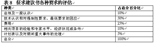 。。在決定了初步要求之后,評(píng)估小組應(yīng)具體地開展評(píng)估工作。具體評(píng)估的目標(biāo)是通過給建議書主要方面打分作出評(píng)估。可以在算出建議書各方面占總分?jǐn)?shù)的百分比,如表8中對(duì)各方面的總覽。一般在建議書內(nèi)向提供者給出這一信息。