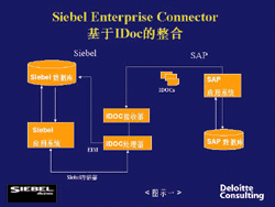 在這個(gè)名為Siebel Enterprise Connector的中間軟件中,這種整合通過兩個(gè)方法來實(shí)現(xiàn)。一是通過中間文件(Intermediate Document IDoc)實(shí)現(xiàn)的整合(圖示一),它可以把SAP中的基本信息輸入到Siebel中,其中IDocs接收器接收從SAP服務(wù)器中存儲的關(guān)于客戶戶口、聯(lián)系人、產(chǎn)品和價(jià)格等信息,然后把這些信息存入IDocs界面中,這個(gè)界面是Siebel的整合管理(Enterprise Integration Manager,EIM)的一部分,于是這些信息就可以完全傳入到Siebel中。這樣的整合不僅在CRM最初啟動的時(shí)候可以用來進(jìn)行數(shù)據(jù)轉(zhuǎn)化,而且在ERP和CRM的同步運(yùn)行中還能不斷地把最新調(diào)整的產(chǎn)品目錄、價(jià)格和折扣等信息輸入到前端軟件中,讓銷售人員可以及時(shí)地給出正確的報(bào)價(jià)。