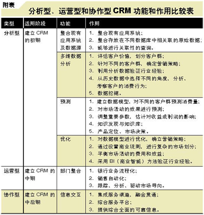 在上述目標下,有什么類型的產品可供選擇呢?對銀行來說,有分析型、運營型和協(xié)作型3類CRM,而這3類CRM也有著很大差別,對于有不同需求的銀行需要有不同的選擇。下面詳細分析這3類CRM。