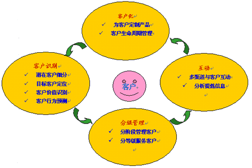流程涉及到客戶生命周期管理、知識管理的流程。具體來說,流程涉及到兩大方面,其一,CRM成功實施后的企業(yè),應該在業(yè)務流程上一個變革。企業(yè)各個部門開展業(yè)務的共同前提是:以客戶為中心。其二,企業(yè)應當通過CRM來建立一種客戶管理的優(yōu)化流程,從客戶識別,到分級管理,再到企業(yè)與客戶互動,再到為客戶定制產(chǎn)品;然后循環(huán)往復。具體我們可以參見下圖: