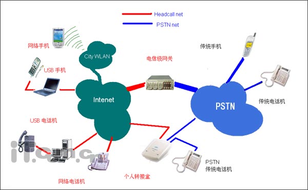 IP網(wǎng)絡(luò)電話和普通(PSTN)電話到底是怎么樣解決互通問題的呢?下面的我們詳細的探討這個問題。我們都知道,互聯(lián)網(wǎng)與普通的電話網(wǎng)絡(luò)是不同的兩個網(wǎng)絡(luò),要是實現(xiàn)IP網(wǎng)絡(luò)電話和普通(PSTN)電話互通就必須使用一種設(shè)備連接這兩個網(wǎng)絡(luò)。如下圖所示: