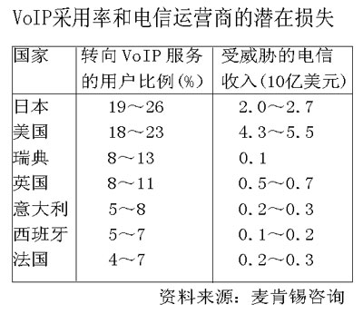 新興的寬帶運(yùn)營商紛紛推出寬帶電話業(yè)務(wù),對(duì)傳統(tǒng)電信運(yùn)營商的話音業(yè)務(wù)構(gòu)成了嚴(yán)重威脅。如:美國的AOL、Seednet等互聯(lián)網(wǎng)服務(wù)提供商和MSN、Yahoo等網(wǎng)絡(luò)內(nèi)容提供商等都借助VoIP積極進(jìn)入話音服務(wù)市場(chǎng)。