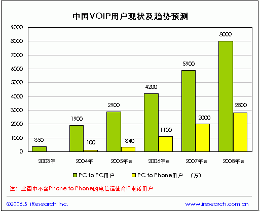 中國VOIP市場上PC to PC的VOIP電話主要是通過即時通訊軟件和語音聊天室來實現(xiàn)的,目前這部分服務(wù)絕大多數(shù)是免費的,尚未給服務(wù)公司帶來直接的經(jīng)濟收入。根據(jù)iResearch的統(tǒng)計數(shù)據(jù),2004年中國PC to PC的VOIP電話用戶達到1900萬,2005年有望達到2900萬。由于信息產(chǎn)業(yè)部在2003年2月發(fā)布的《電信業(yè)務(wù)分類目錄》中規(guī)定IP電話屬于第一類基礎(chǔ)電信業(yè)務(wù),但“IP電話業(yè)務(wù)在此特指由電話網(wǎng)絡(luò)和IP網(wǎng)絡(luò)共同提供的Phone-Phone以及PC-Phone的電話業(yè)務(wù)”,這與目前虛擬運營的Phone to Phone 、PC to Phone的寬帶電話略有不同,盡管如此這一規(guī)定對提供Phone to Phone 和PC to Phone的非電信運營商有著非常大的制約,目前在我國提供“到電話”的VOIP服務(wù)除部分基礎(chǔ)電信運營商試驗外多為暗中操作,存在較大的風險不能通過大規(guī)模的市場推廣來迅速吸引用戶,因此PC to Phone的VOIP電話用戶增長速度將相對平穩(wěn),據(jù)iResearch預(yù)測,2008年中國的PC to Phone的VOIP電話用戶將達到2800萬戶。