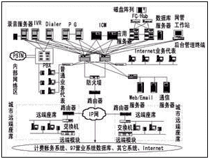 該方案采用Cisco的ICM中間件軟件作為系統(tǒng)的CTI服務器軟件平臺,并采用相關廠商的IVR和Dialer產品作為IVR服務器和外撥服務器軟件。地市客服中心采用了交換機的遠端模塊設置遠端座席。Cisco的ICM中間件不但具有大話務量處理的高性能,而且支持多點呼叫中心的設置和基于純IP技術的呼叫中心的擴充,從而保證了系統(tǒng)的可擴展性。系統(tǒng)結構如圖1所示。