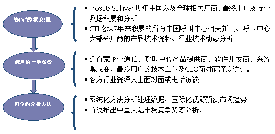 Frost & Sullivan 和 CTI論壇(zgjsgm.com)共同組成的調(diào)研小組,在查閱了大量資料的基礎(chǔ)之上,以企業(yè)通信及呼叫中心的設(shè)備應(yīng)用、投資計劃以及相關(guān)廠商的市場表現(xiàn)為出發(fā)點,通過對企業(yè)通信及呼叫中心重要應(yīng)用企業(yè)、在市場占主導(dǎo)地位的二十多家設(shè)備廠商、二十多家軟件開發(fā)商、十幾家系統(tǒng)集成商、數(shù)家外包運營商的深度訪談,參閱內(nèi)部相關(guān)報告及數(shù)據(jù)庫,對數(shù)據(jù)的來源和數(shù)據(jù)的準(zhǔn)確性進(jìn)行了詳細(xì)核對與論證;憑借參與調(diào)研人員的多年從業(yè)經(jīng)